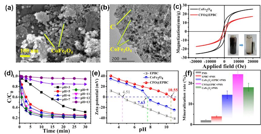 高级氧化技术(AOPs)被广泛认为是一种去除水中难降解有机物的有效方法。基于钴/铁氧化物纳米材料的非均相高级氧化技术具有优异的污染物降解性能和磁分离特性,但其相对较窄的pH适用范围限制了其实际应用。此外,钴/铁氧化物纳米颗粒表面能较高,易发生团聚现象,严重削弱了此类材料的催化性能。