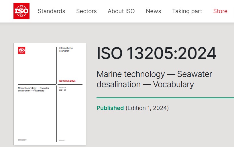 2024年6月13日,由我国主导制定的ISO 13205:2024《海洋技术-海水淡化-术语》(Marine technology - Seawater desalination - Vocabulary)正式发布。 6月19日,海水淡化ISO国际标准ISO/NP 25175《反渗透(RO)和纳滤(NF)膜元件性能的标准测试方法》(Standard test method for performance of reverse osmosis (RO) and nanofiltration (NF) membrane element)立项成功。两项标准均由国际标准化组织船舶与海洋技术委员会海洋技术分委会海水淡化工作组(ISO/TC8/SC13/WG3)研制,标志着我国海水淡化标准国际化工作再获新突破。