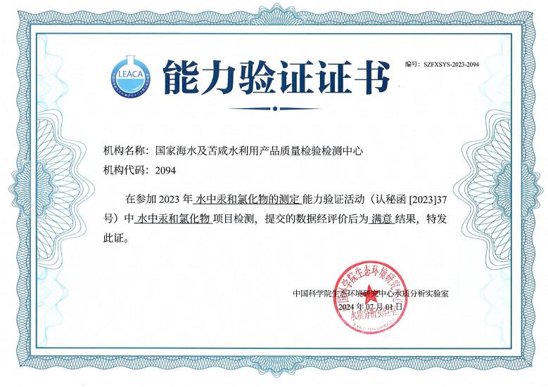 近日,国家海水及苦咸水利用产品质量检验检测中心接到证书,我中心通过了由国家认监委于2023年11月组织的“一带一路”国际检验检测机构水质领域能力验证(认秘函〔2023〕37号),结果获得“满意”。