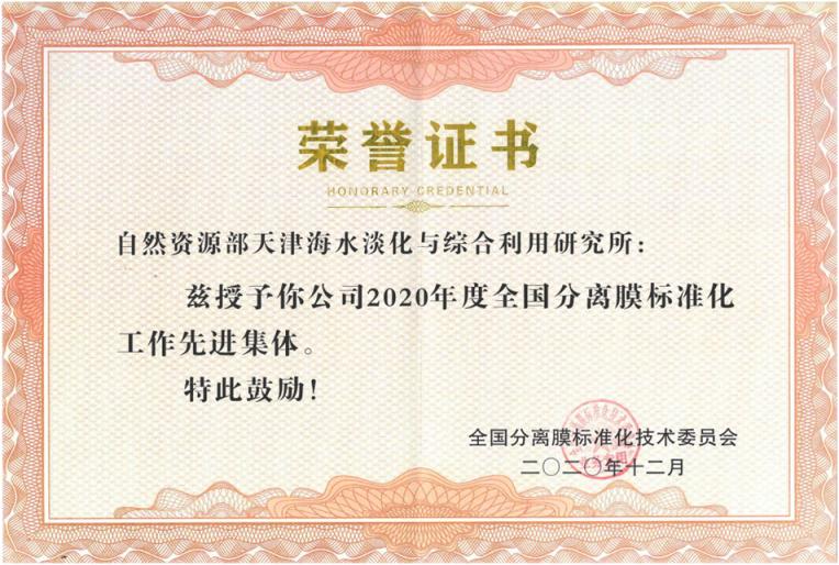 2020年12月22日,全国分离膜标准化技术委员会(SAC/TC 382)召开了“2020年度标委会年会暨膜技术专题报告会”,会上宣读关于表彰自然资源部天津海水淡化与综合利用研究所获得2020年度全国分离膜标准化工作先进集体的决定,并颁发了奖杯和奖状。我所作为全国唯一一家受表彰单位,在2020年牵头编写了两项分离膜技术国家标准,分别是GB/T 38902-2020《中空纤维膜丝截面结构尺寸的测定图像分析法》和GB/T 38949-2020《多孔膜孔径的测定标准粒子法》,该两项标准已经发布,为统一规范国内中空纤维膜截面结构尺寸和膜孔径的测试方法做出了贡献。潘献辉主任受阮国岭所长委托发表了获奖感言,潘主任首先感谢全国分离膜标委会的精心组织和各位专家委员对我所标准化工作和标准编写的指导给与大力支持;其次我所作为全国海洋标准化技术委员会海水淡化与综合利用分技术委员会(SAC/TC 283/SC4)的秘书处单位,将加强与全国分离膜标准化技术委员会(SAC/TC 382)的沟通联系,密切配合协同发展,推出更多更优质的分离膜国家标准和海洋行业标准,为我国膜行业的发展提供有力的技术支撑;最后表示我所质检中心将积极参加膜技术标准的制修订,严格依据膜技术标准进行检测,将最新的膜技术标准扩项到资质范围内,为全国分离膜行业提供更加优质的检验检测服务。