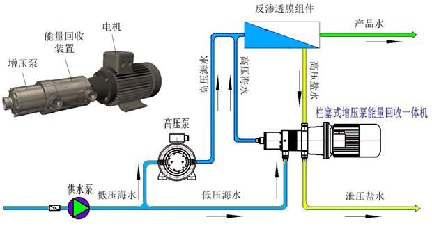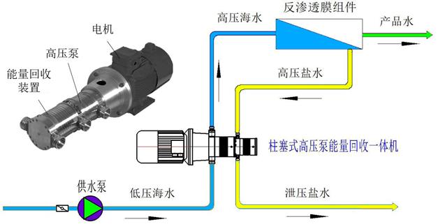 柱塞式高压泵能量回收装置集电机、能量回收设备、增压泵或/和高压泵为一体,能够实现海水淡化系统中三大关键装备:能量回收装置、高压泵和压力提升泵的全部功能,具有小型化、高效率、低噪音、重量轻、易维护的特点。