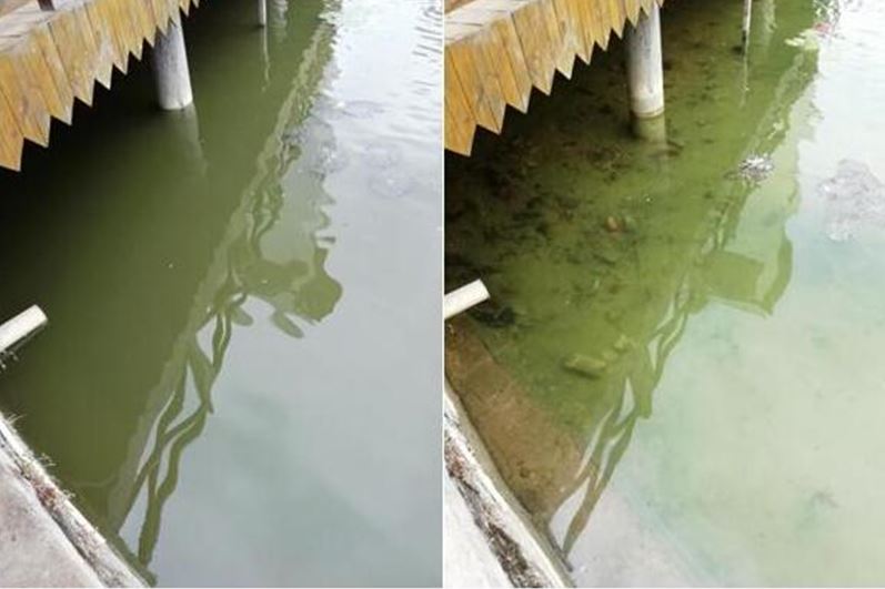 坑塘位于于都县潭头村,共3个,总面积约2000m2,总容积约3000m3。经团队对污染水体现场考察以及开展相关调研工作发现,该水体由于生活污水不断混入,导致水体浑浊,并伴有一定异味。前期村委虽通过增加喷泉以及种植荷叶等手段进行治理,但收效甚微。