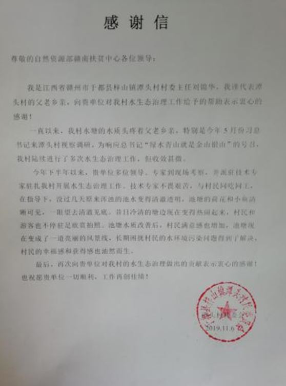 2019年9月,在自然资源部赣南扶贫中心的协调下,我所派驻技术人员驻扎潭头村开展水生态治理工作。技术人员通过水样检测、分析和方案论证,最终采用我所攻关研发的高孔藻基净水剂为主体并配合生态浮岛等技术手段开展治理。经治理,池塘水质明显改善,荷塘、小鱼清晰可见,村民满意感增加,池塘现在变成了一道亮丽的风景线,长期困扰村民的水环境污染问题得到了解决,村民的幸福感和获得感油然而生。2019年11月6日于都县潭头村委会代表帮扶村民向我所送来感谢信。