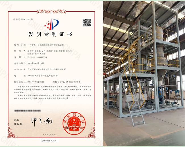 淡化所自主研发连续结晶纯化产业化关键技术,研发了“两段热溶灭晶-清液晶浆分排”的冷却结晶生长纯化产业化技术及装备,采用真空闪发降温结合强制循环的冷却运行方式,优化结晶器内部结构,增加外循环系统,实现了冷却结晶过程的连续运行,提高生产效率及产品质量,可应用于光卤石、硫酸铜、硫酸镍、硼酸等多种无机晶体的冷却结晶生产领域。